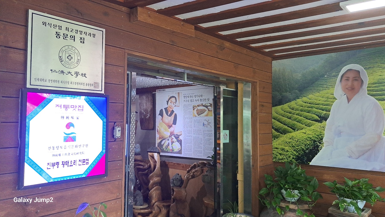 주차장에 차를 세우고 식당 건물을 바라보면 독특한 외관이 시선을 사로잡습니다. 네온사인과 목재로 덧댄 간판들이 어우러져 묘한 조화를 이룹니다. 네온사인 입구를 들어서면 아늑한 휴게 공간이 먼저 반겨주고, 벽면에는 주인장의 얼굴이 담긴 홍보 사진들이 정겹게 걸려 있습니다.
